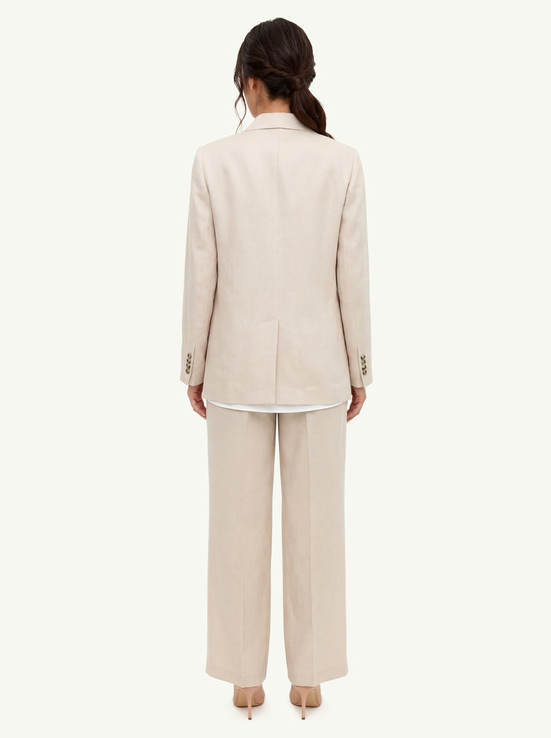 Il fit è dritto ma avvolgente, la spalla cade con naturalezza e la linea segue i movimenti senza costringere. Il tessuto tinto filo avvolge la figura con morbidezza e una lucentezza sobria. Dettagli discreti: cuciture pulite, chiusura nascosta, revers sottile che cade impeccabile.